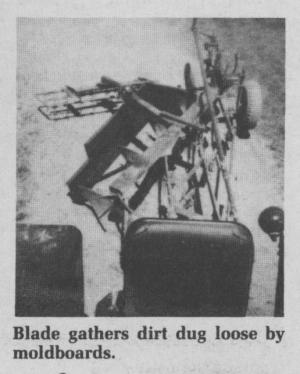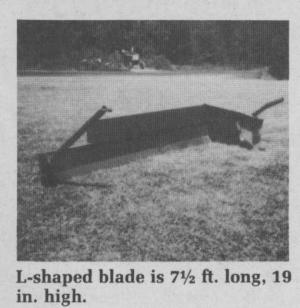 The earth mover fits on Woznica's International 540 four-bottom plow attaching with two brackets. The L-shaped blade is 19-in. high, 7 1/2-ft. long, built of I-beam and steel channel iron, and holds 1 1/2-yards of soil.