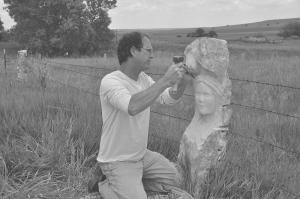 Limestone fenceposts are a common sight in Kansas. But there's only one like the post carved recently by a California sculptor on a pasture owned by Larry Hickman off Hwy. 232 near Lucas, Kan.