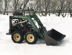 Martens used 1 1/2-in. sq., 1/4-in. thick steel tubing to build a rollover cage. The 6-ft. wide bucket was custom made. A separate 12 gpm hydraulic pump operates a pair of hydraulic cylinders that raise or lower the arms. Two more cylinders are used to tilt the bucket.