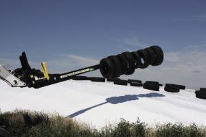 No more tossing water-filled tires on silage piles with the Tire Gator 160. The 15-ft. beam with its self-loading bull nose makes picking up tires as easy as point and drive. Raised teeth on the #60 roller chain that runs the length of the bar pull the tires onto the bar and later feed them off as desired across the pile.