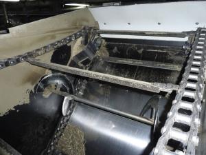 The sides of the mixing box are made from 1/8-in. thick steel and the floor is made of stainless steel. Two 30,000-lb. "WH-78" chains with angle-iron slats spaced 16 in. apart, run at low speed providing a fast mix with a low horsepower requirement.