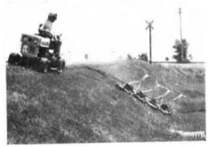 My uncle Ed Bleich, Paxton, Ill., has been mowing steep roadsides this way for years. He hooks up four push mowers, connecting the front right corner and back left corners of the mowers together and then runs a chain from the four ganged mowers up to his riding mower. He can shorten or lengthen the chain as needed to mow down to the bottom of any ditch. When he's done, the push mowers can still be used normally. (Delaine Bleich, 1512 W. 215 St., Torrance, Calif. 90501)