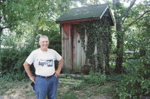 Old 2-Holer Outhouse FARM HOME Miscellaneous Friends and neighbors get a kick out of the old 2-holer outhouse that I moved into my back yard several years ago The outhouse is at least 100 years old and makes quite a conversation piece It’s made from cypress wood painted red and has a green tar paper roof The building is covered by ivy vines and surrounded by some old steel wheels with a couple of steps leading up to it It sets in a nice shady location It’s like having a work of art in our yard John Eilers 2029 E 350 N Pana Ill 62557; ph 217 562-4021