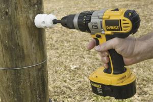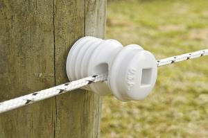 “We use a super strong plastic that looks like porcelain and lasts just as long,” says Alan Johnson at Zareba systems. “You can screw it into wood fence posts like other porcelains, but it only takes seconds because it has an adaptor on top to use a cordless drill.”