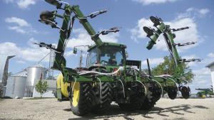 Fertilizer is carried in 250-gal. saddle tanks mounted on the sides of his Deere 8100 MFWD tractor. “I like this approach because the whole rig is contained on the tractor,” says Rollins. “If I was pulling a wheeled tank behind the bar, that’s another set of wheels to knock down corn. The saddle tanks add about 6,000 lbs. to the tractor frame when full of fertilizer, which easily offsets the weight of the bar.”