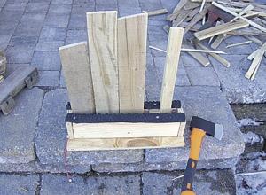 His Pallet Kindling Creator holds cut-up pieces of pallet wood, making it easy to split them into kindling-size chunks with an axe. It consists of a 1 1/2-ft. long rectangular wooden box made from 2 by 4’s spaced about 1 in. apart and screwed to a plywood base. Rubber strips are screwed on top of both sides to keep them from getting dinged up while using the axe.