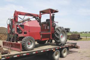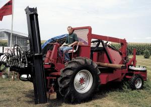 “Six years ago we put in a different 4-cylinder Case motor and IH hydrostatic drive system from a 403 combine,” Dan says. “Now we’re able to control the ground speed a lot easier without stopping to shift gears or changing engine rpm’s.” They also replaced the back axle with a stronger setup from an old 4400 Deere combine. A new steel canopy over the control station protects the operator as posts are lifted into the driving mechanism. It also shields the operator from the sun and from low-hanging branches if they’re working on wooded pastures. Painted red to match the rest of the machine, the canopy looks like original equipment.