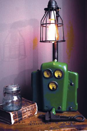 Carling also makes lamps adorned with old-time steam gauges. “I bought a bunch of gauges and parts off old steam tractors and figured out a way to put them together,” he says. “I also use the steam gauges off old pressure cookers and ones used on sprinkler control valves from old buildings and factories. Some of the gauges are so beautiful that I find it hard to part with them.”