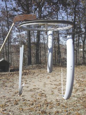 He used a wheel off an old 10-speed bike with the tire removed. It hangs from an angled frame that can be set up anywhere. The parts hang from wire hooks that attach to the wheel spokes.
