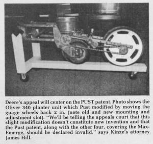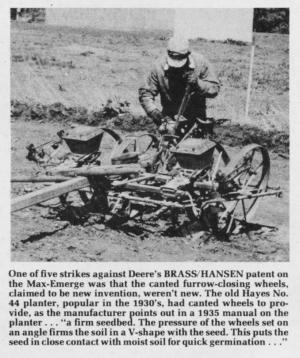 The Deere-Kinze dispute dates back to 1976 when Kinzenbaw, then 31 years old and owner-operator of a small machine and tractor repowering shop which he'd launched after graduating from high school, invented a revolutionary tool bar which accommodates from 8 to 36 row units, yet folds horizontally ù right from the tractor seat and without having to remove any row units ù in seconds to a narrow, 14.5 ft. for transport. It's generally conceded among farmers that Kinze Mfg. has the best corn-soybean planter tool bar on the market, and that Deere's Max-Emerge is far and away the best corn-soybean planter unit, accounting for well over 80% of total annual planter sales.