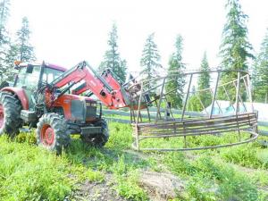 The only modification needed on the ring was to add 2 chain anchor rings separated by about a third of the ring circumference. To use, MacLennan approaches the bale ring opposite the anchor rings and slips the bale spears into it. He then runs chains from the anchoring rings to the top of the bale carrier frame.