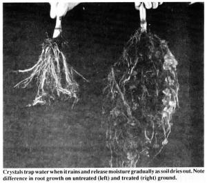 Aaron Zemler, who farms near Colorado Springs, planted 55 acres of corn with the crystals and another 55 acres without. Both fields were irrigated. The fields received the same amount of water and fertilizers. Although Zemler was skeptical when he started the test, by harvest time, all his doubts had disappeared. "We got 3,000 more pounds of corn silage where we used the crystals. When you get a rain on this sandy soil, the water goes out of sight in an hour or two. The crystals hold it near the plant roots where it belongs."
