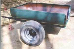 I cut a 265-gal. fuel oil tank in half and then welded bed frame angle irons around the edges to build this 2-wheeled trailer. Bed frames are made from springy, high carbon steel so you don’t want to use them on structural projects or they’ll crack, but they work good as an edge liner to hold the tank straight. The tank manually dumps out the back and pivots on a metal pin that’s welded onto the axle. A pair of unistruts welded on back of the trailer form slots for a “drop board” tailgate.