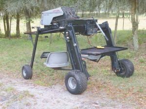 The rig’s 2 swivel chairs are off a fishing boat, and each one is mounted on an arm that can be swung sideways and also up or down. The front cargo rack can also be adjusted up or down and swiveled from side to side.
