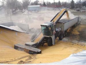 “The Gobbler can move 20,000 bu./hr. and load a 1,000-bu. semi truck in just over 3 min. It can move grain twice as fast as 2 wheel loaders but uses only half as much fuel and requires only one operator. The conveyor and header auger bolt together and can be loaded on a double drop deck trailer for transport.”