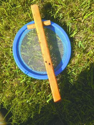 Riehl used the plastic pail lid to make a screen to catch any larger bits of apple expelled with the cider. After cutting out the center of the lid, he cut aluminum window screening to fit.