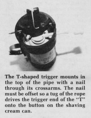 Next comes the tricky part ù making the trigger which presses down on the shaving cream can button. Cut out a 3-in. wide, 4-in. long section from another piece of 3 in. dia. plastic pipe, and fashion it into a "T" shape. The firing pin, or top of the "T", should be about 1/4 in. long (see photo).