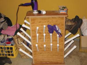 The hair dryer fits into a 2-in. pvc coupler at the top of the box and forces air inside a 3-ft. tall, 18 by 6-in. wooden box with pvc pipes sticking out of it on 3 sides. Each pipe is capped at the top. To dry his boots, Brubaker pulls the caps off and places the boots upside down over the pipes and then turns on the hair dryer. A timer controls how long the hair dryer runs.