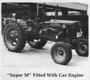 Super M Fitted with Car Engine TRACTORS Miscellaneous 10-1-7 The desire for an older tractor that could move faster for spraying, and when going from field to field, prompted Keith Peterson, Moorland, Iowa, to install a 302 engine and C-4 transmission from a 1974 Ford Maverick into an International "Super M" tractor. Peterson says his modified tractor, used primarily for crop spraying, has a top speed of 50 mph.