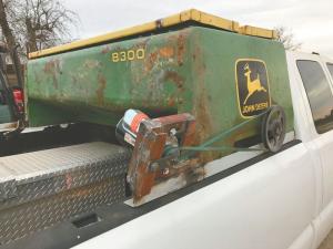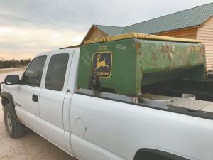 “Webb found a Deere 8300 grain drill box in my salvage yard that he thought would be just the right height to set on the pickup’s bed rails and still be even with the top of the cab. By mounting the feeder on the rails he gets full use of the 8-ft. bed to haul things underneath the feeder.”