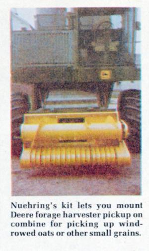 "We can fit all Deere combines from 1973 to the new 20 series, and can custom tailor adapters for most other brands of combines," reports Harley Nuehring, Kanawha, Iowa, farmer who has invented and patented a kit that lets you attach the hay header from Deere's forage harvester directly to the combine's feeder house to pick up windrowed oats, wheat and other small grain, or alfalfa seed.
