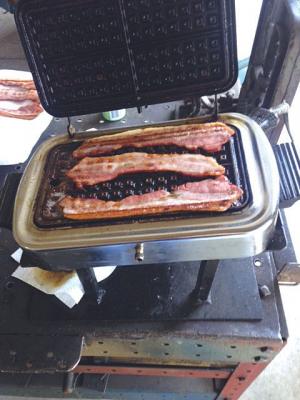 “I cook the bacon in my shop while I’m doing other small jobs so no time is wasted,” says McNaughton. “It works like a charm. I usually put 3 strips of thick-cut bacon on the waffle iron, then close the lid and let the bacon cook for 6 min. The bacon stays nice and straight and is evenly cooked.”