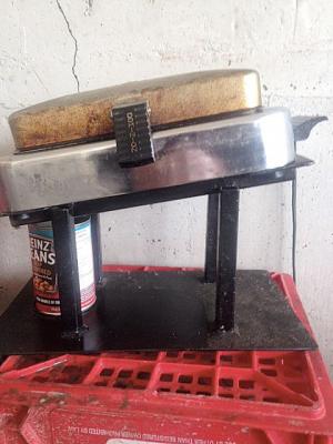 McNaughton drilled a hole into one end of the waffle iron and welded an aluminum drain spout in it in order to drain the bacon grease into a soup can below. He made a stand for the waffle iron by building a small stand that’s set at a slight angle, which allows grease to drain into the spout.
