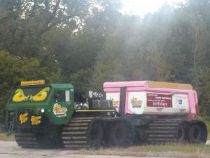 The chassis was built completely from scratch with an articulated steering joint at center. The cab is off an old Army tank retriever, and the dump box sits on its frame. Dunneisen built the tracks using steel, rubber belting, and UHMW plastic and attached wooden slats to the tracks for maximum traction.