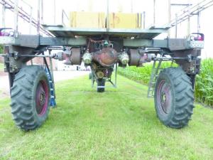 That, of course, was just the start. Ewen completely replaced the back end of the spreader from the transmission back, including legs for the drive wheels. He used the rear end of a Chevy truck with air brakes and turning brakes. He also used a mechanical final drive system from a Deere 7700 combine. He mounted them in legs he fabricated to give the sprayer extra clearance.