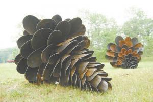 Eye-Catching Giant Pinecones AG WORLD When Floyd Elzinga’s giant metal pinecones went viral on the internet people speculated that they were made out of shovels He actually makes the 1-ton 10-ft long pinecones out of laser cut steel bending pieces on a press before welding them together in a spiral pattern “There’s something about the shape and idea of the pinecone that has resonated with people It’s a very systematic pattern the way the scales are put on ” Elzinga notes His first large pinecones were commissioned by a Canadian who moved to the West Coast The pinecones line his driveway looking like they fell from a giant tree Elzinga does other sculpture work but says the pinecones seem to be popular with everyone He lists pieces for sale on his website and sells them through screened galleries Contact: FARM SHOW Followup Floyd Elzinga 3841 Mountain St Beamsville Ontario Canada L0R 1B2 ph 905 563-5926; www floydelzinga com; Floyd elzinga@sympatico ca