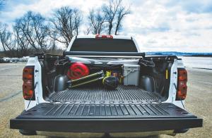 “The topper folds down and stows away under the tonneau cover at the front of the pickup box. It’s suspended off the bed of the truck, so you can carry cargo under it. When the topper is down, you can roll the tonneau cover out over it or leave the box open,” says Schmeichel.