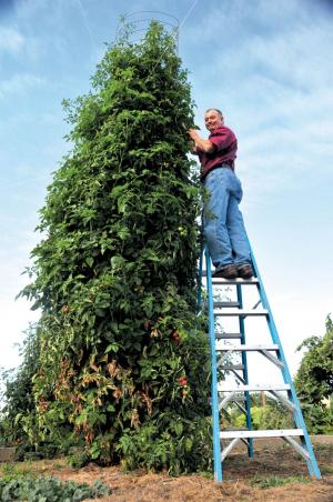 Jim Zamzow has harvested as much as 1,000 lbs. of tomatoes from his monster tomato plants that reach 20 ft. high or more, outgrowing his 17-ft. tall tomato cages. He credits sun, space, and the soil-building products he markets under his own Dr. JimZ brand.