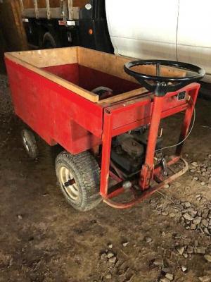 The cart measures 4 ft. long by 30 in. wide, allowing it to fit between 30-in. rows. Power is provided by a 3 1/2 hp. gas engine and 3-speed transmission off a Dynamark riding mower. The operator pulls back on a “tilt back” steering wheel, which engages the transmission’s clutch to propel the cart forward. Speed can vary from a creep to a slow walk.