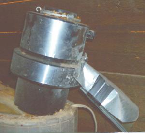 He removed the discharge pipe from the disposal and then made an 8-in. long tin spout, drilled a hole in it, and bolted it on. The spout directs the ground-up grain into a 5-gal. pail. He wired the disposal to a 120-volt male plug.