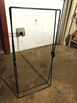 It consists of two rectangular metal rod frames that connect at the center and fold out into an “X” shape with the back stretched over the top.