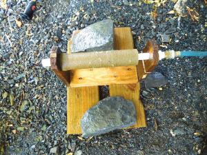 The 1-in. dia. perforated pvc pipe is suspended horizontally off the ground on a pair of wooden brackets. The pipe goes all the way through the filter and is connected to a garden hose. The other end is capped shut. Zonies drilled a series of tiny holes about 1/4 in. apart into one side of the pipe.