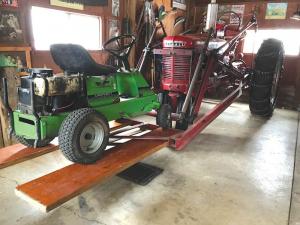 Neil Stemmann gets double duty out of the loader on his Farmall H tractor, thanks to his home-built lift adapter. Twin 5-ft. long, 2 by 12-in. wood engineered boards are attached between the lift arms, making it easy to work on his riding mowers. He just drives the mower onto the boards and then raises the loader.