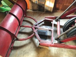 The loader is original to the tractor, which was built in the mid 1940’s. Stemmann replaced the bucket with an angled blade purchased from a friend, which he uses to plow snow off his driveway. The back side of the blade is welded to a semi-circular steel frame. It pins onto another frame that Stemmann built, which bolts onto the loader arms. The semi-circular frame and blade can be easily removed with one center pivot bolt and nut, and the blade’s angle can be adjusted by changing the position of a pin.