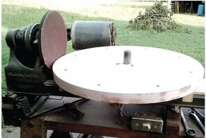 “I marked a circle on the plywood and cut it out, then bolted a pulley to it, rigged a shaft, and mounted it flat on my wood lathe’s bed. By using a sanding plate on the spindle, I was able to make a perfectly round wheel. I then used the pulley to fasten the wheel to the saw.