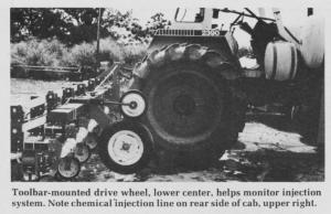 The control unit mounted in the tractor cab controls the amount of chemical injected per acre and monitors the miles per hour, acres covered per hour, and gives a readout of the total amount of chemicals applied per hour. An electrical pump mounted on either the tractor or sprayer pumps chemicals to the sprayer via a hose teed into the suction side of the spray pump.