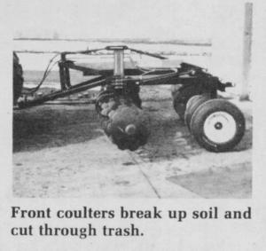 Latest innovation in minimum tillage is the ConServ-All, designed by Harold Reimann, Madison, Wis. It features a gang of coulters on the front that break up the soil and cut trash. A pto shaft runs back to a 3 pt. hitch on the rear of the unit to attach power harrows and other equipment to further break up the soil and incorporate chemicals.