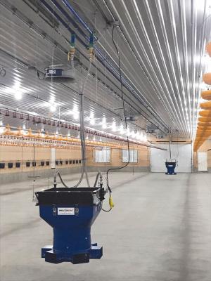 Multiheat International delivers the dry heat preferred in poultry and swine buildings, a heat only available from hot water heating systems. The Dutch company’s heat exchangers and fans distribute it evenly and economically from exterior boilers. Adjustable outlets can handle buildings up to 100 ft. wide.