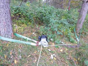 “The winch really earned its way when I was cutting a large pine on a steep slope. Usually I can drop a tree within a few degrees of where I want it to fall. I carefully made my notch cut. As I made my felling cut, the tree settled the wrong way, pinching the chainsaw bar.