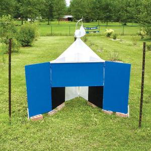 “It seemed like a good addition to our product line,” he says. Along with the Sunbrella® blue and matte black acrylic fabric, he uses weather-resistant mosquito netting, and he contracted with a garment shop to make the traps. Rincon-Vitova sells the traps for $195 (posts not included) and donates $10 of that for biting fly control research.