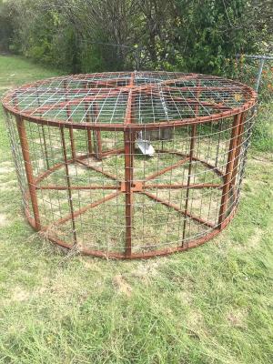 Stracener built the trap by welding livestock panels with 4-in. square openings onto the top and sides of a utility reel designed to hold underground cable. The gate is tripped when the feed trough located next to it is pushed down by feeding hogs.