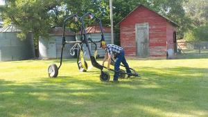 The unit has a hinged tongue which, by pulling 2 pins, can be adjusted to 3 different positions – one for transport mode that lifts the caster wheels off the ground; one that frees up the tongue so it can be pulled behind a 4-wheeler, skid loader, or pickup; and one that raises the tongue up out of the way for storage.