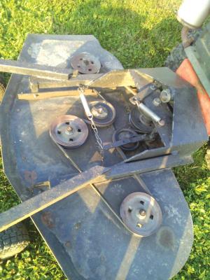He used the pulleys and components from the JD mower, including the blades. He built the outrigger and heavy-duty deck out of 1/8-in. steel, that cost him about $120.