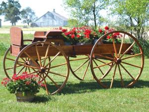The wagon measures 8 ft. long by 3 ft. wide by 80 in. high. It rides on 42-in. dia. front wheels and 48-in. dia. rear wheels. Although intended only for display, the wagon rolls so that you can easily move it around your property.