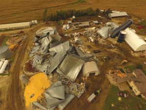 Minnesota farm brothers Brian, Chris and Bruce Peterson couldn’t believe their eyes when they ventured outside after a huge tornado lifted away from their Northfield farm in September, 2018. “Our farmsite was a tangled mass of metal from 15 grain bins, 2 grain legs, and 3 crushed sheds, along with a bent-over Harvestore silo and dozens of fallen trees,” says Brian. “All of us wondered how we’d get through this, with harvest just around the corner, and the bigger issue, how we could ever rebuild.”