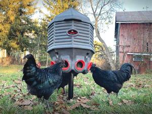 “The ports are elevated, which lets chickens reach in and eat without scratching out feed,” says Tom. “The feeder has drip edges on the lid and body, and hooded drip guards over the ports to keep the feed dry. The internal funnel system keeps the feed only about one inch deep inside the ports, which helps reduce waste.”